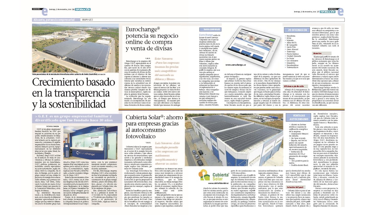 Un reportaje muy completo, realizado tras la entrevista a nuestros Consejeros Delegados, que transmite muy bien los valores y la evolución tanto del grupo como de dos de nuestras empresas: Eurochange (cambio de divisas) y Cubierta Solar (soluciones para autoconsumo eléctrico industrial).